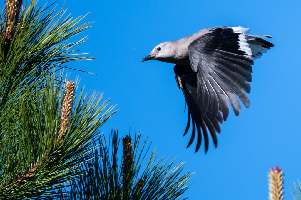 Clark’s Nutcrackers like the thin mountain air. They’re often found near timberline, hanging out high in the pines or flying in a small group known as a “booby,” “ballet” or “suite,” among others. I get the “ballet” because they’re rather graceful flyers. “Suite” is less descriptive, and “booby” makes no sense to me at all. Maybe someone can explain it.