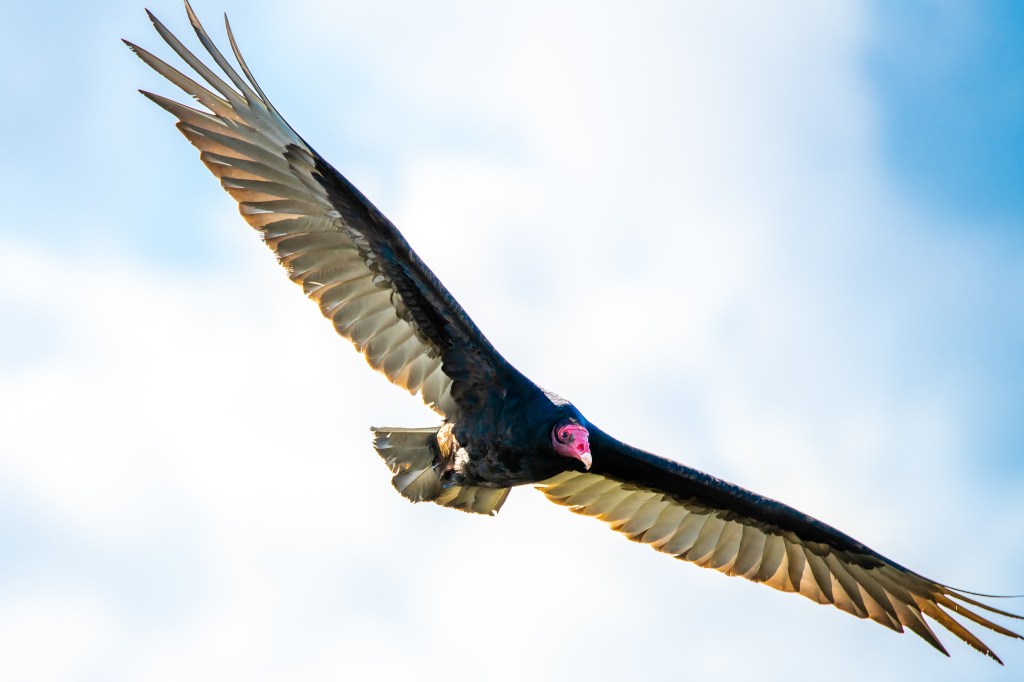 That naked, red head isn’t just for show, though. It does serve a purpose. It allows Vultures to “dig in,” so to speak, without collecting a lot of rotten gunk in their head feathers while they’re dining. They also have strong stomach acid, so they’re able to ward off diseases they might otherwise contract from carrion. In other words, they’re well-equipped to clean up after your Volvo.