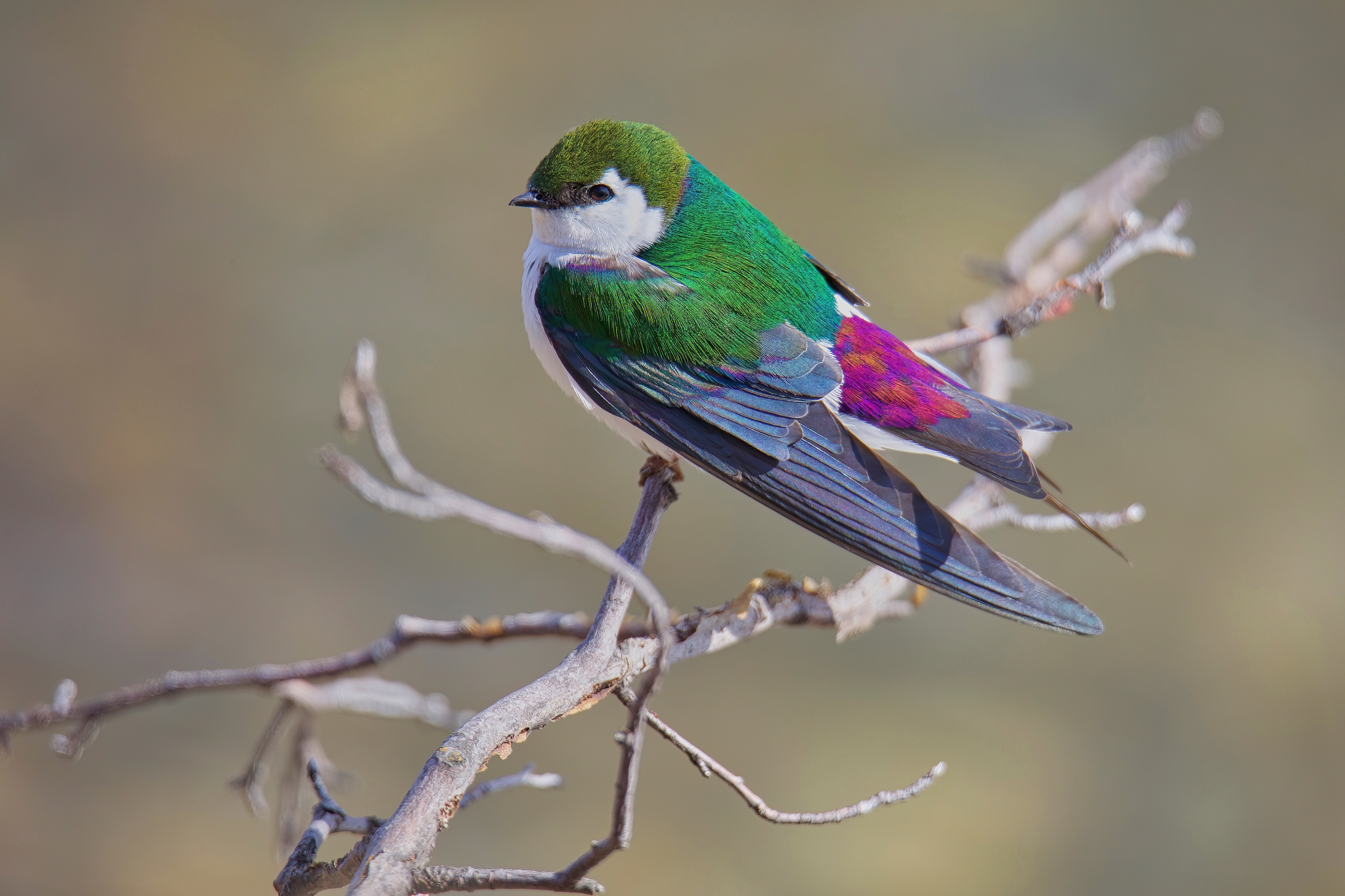 You would be excused for thinking of the Violet-green Swallow as the jewel among its kind. The name is appropriate, at least for the male, with its almost iridescent green across the shoulders, down the back and over the head, along with the wash of violet on the wings and descending from the base of the tail. It looks like some mad artist decided to throw paint around and created astonishing beauty out of colors that shouldn’t go together.