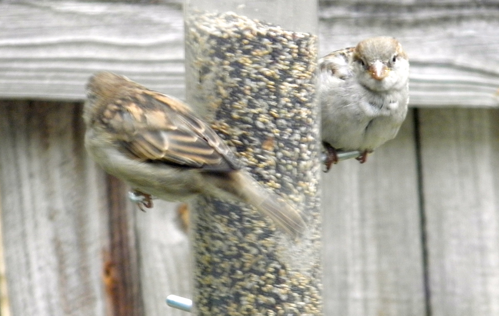 Two female House Sparrows are happy to share the feeder, as long as they can’t quite see each other.